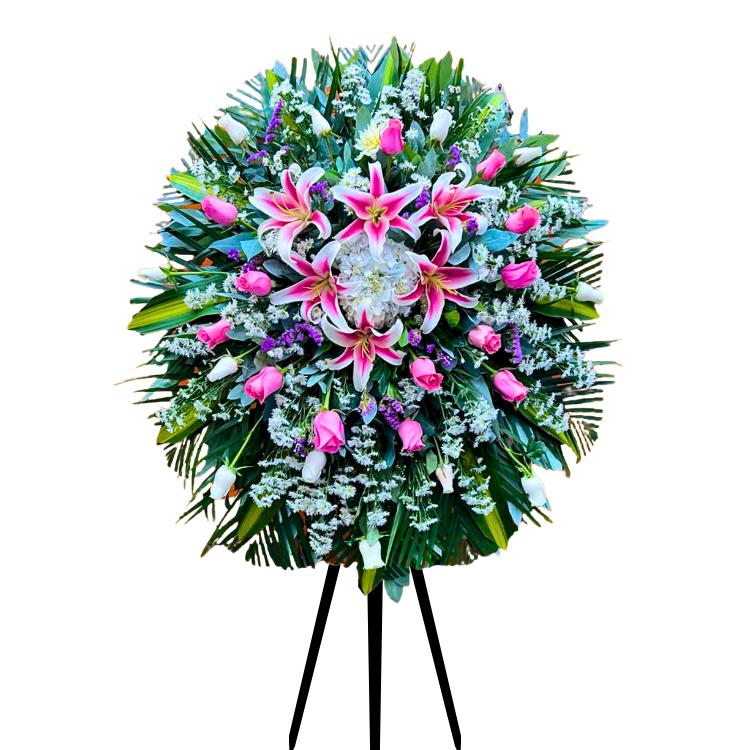 Delicada corona con lirios rosados, rosas blancas, hortensias y astromelias.