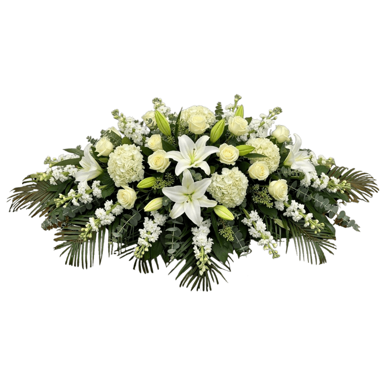 Elegante manto con rosas blancas, lilium blancos perfumados y finos follajes.