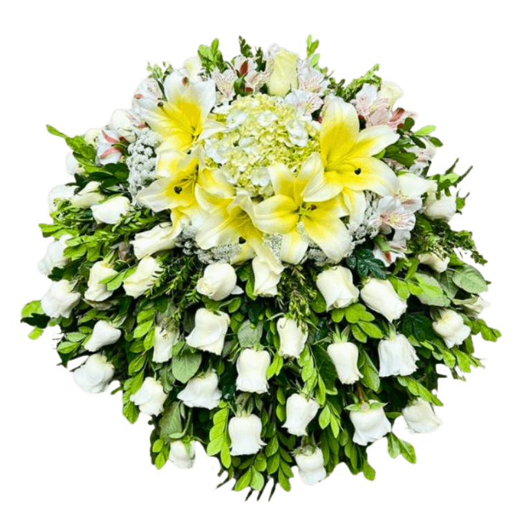 Manto con dos docenas de rosas blancas, lilium blancos, mirto, ramas de eucalipto, hortensias y finos follajes.